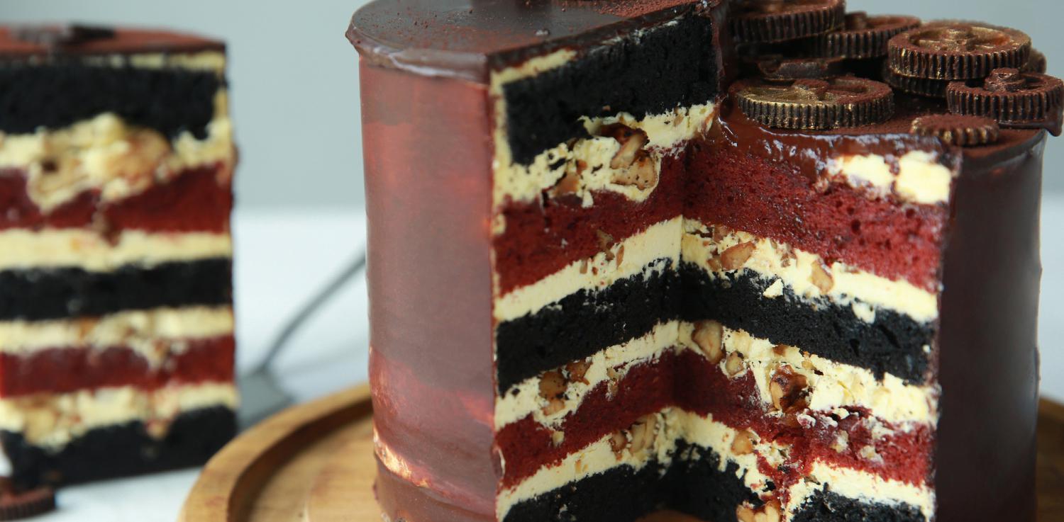 原材料: 安佳黄油(新西兰)/稀奶油(法国)/红丝绒(比利时)/法芙娜巧克力(法国)/琥珀核桃(美国)/可可粉(法国)/黑朗姆酒(牙买加)